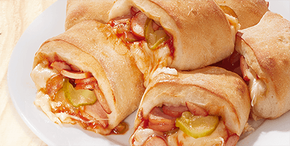 Hot Dog Würstchen, eingelegte Gurken, Ketchup und Käse im gebackenen Teigmantel.