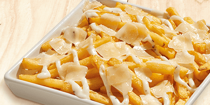 Knusprig gebackene Pommes mit Trüffelmayonnaise und Gran Biraghi als Topping.